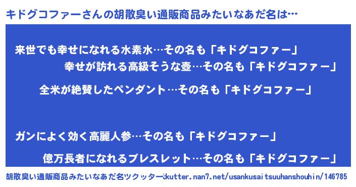| 男性向けラノベタイトル風あだ名 | 『キドグコファーの嫁は女の子じゃないと思った?』 |