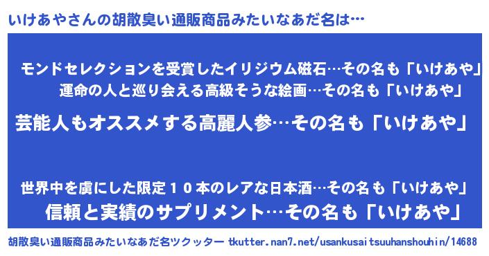 | 男性向けラノベタイトル風あだ名 | 『Re:いけあやから始める異世界生活』 |