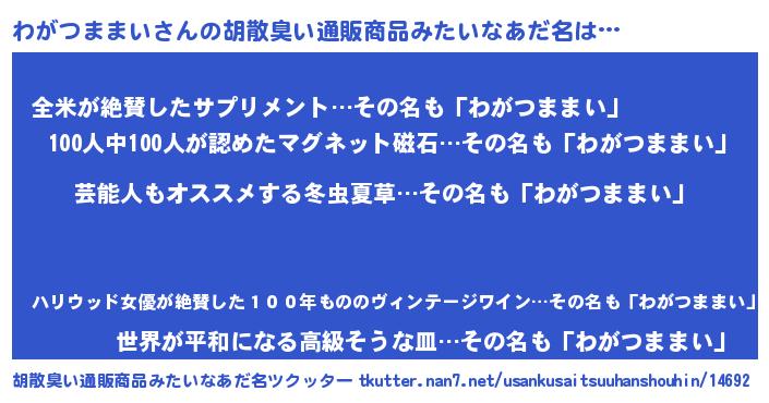 | ポケモン風あだ名 | 『ワガセウス』『ヒワガツママイ』 |