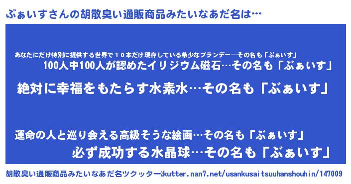 | 男性向けラノベタイトル風あだ名 | 『ぶぁいすという概念が存在しない退屈な世界 』 |