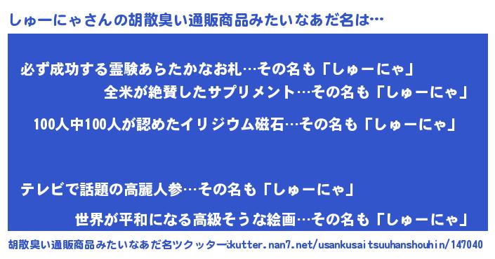 | ヒーロー風カッコイイあだ名 | 『正義の使者しゅーにゃ』『魔戒騎士シュ』 |