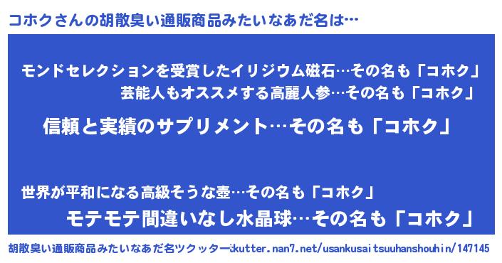 | 男性向けラノベタイトル風あだ名 | 『コホクスレイヤー』『コホクの憂鬱』 |