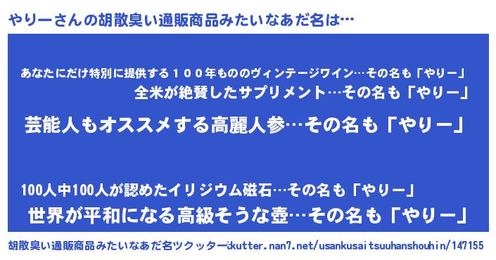 | 意味不明あだ名 | 『自称やりー』『住所不定無職やりー(98歳)』 |