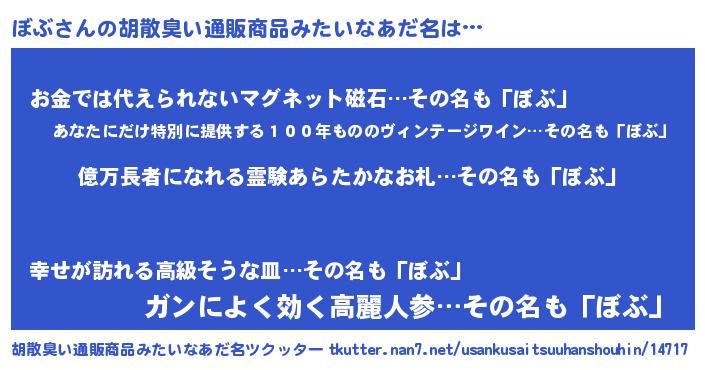 ぼぶさんの胡散臭い通販商品みたいなあだ名をツクッター!