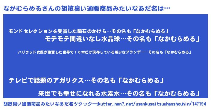 | ヘコむあだ名 | 『なかむらめる(苦笑)』『なかもー』 |