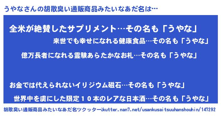 | 男性向けラノベタイトル風あだ名 | 『うやな~年齢イコール彼女いない歴の魔法使い~』 |