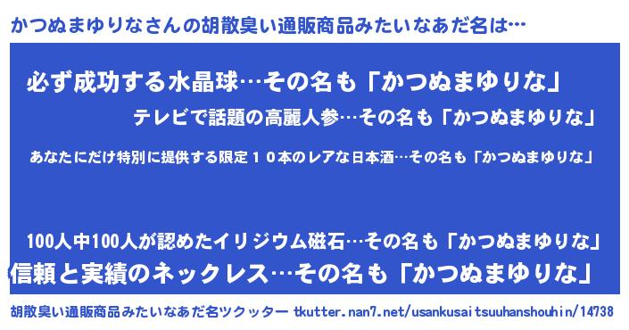 | 意味不明あだ名 | 『住所不定無職かつぬまゆりな(40歳)』 |
