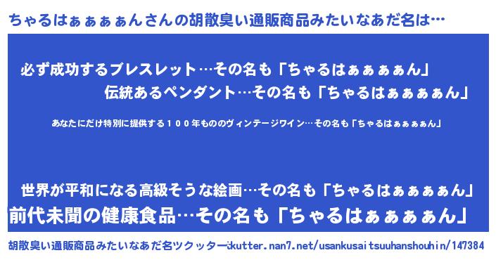 | 男性向けラノベタイトル風あだ名 | 『この素晴らしい世界にちゃるはぁぁぁぁんを!』 |