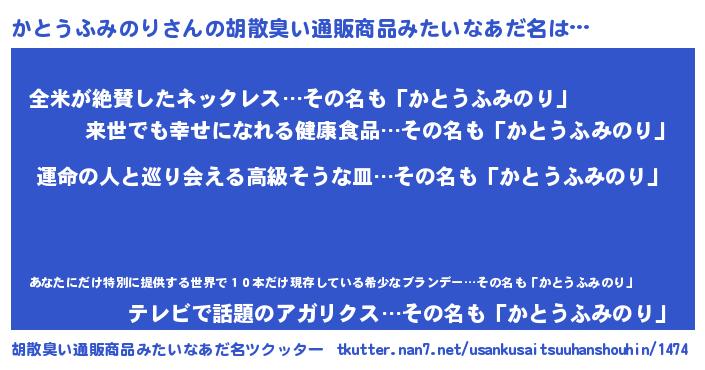 | 男性向けラノベタイトル風あだ名 | 『かとうふみのりに滅ぼされるだけの簡単なお仕事です』 |