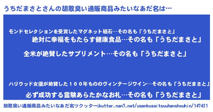 | 意味不明あだ名 | 『とにかく怪しいうちだまさと』 |