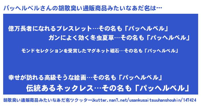 | 男性向けラノベタイトル風あだ名 | 『パッヘルベルに滅ぼされるだけの簡単なお仕事です』 |