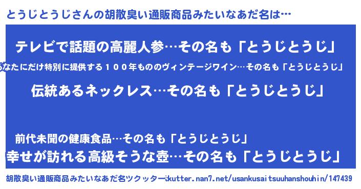| 男性向けラノベタイトル風あだ名 | 『転生したらとうじとうじだった件』 |