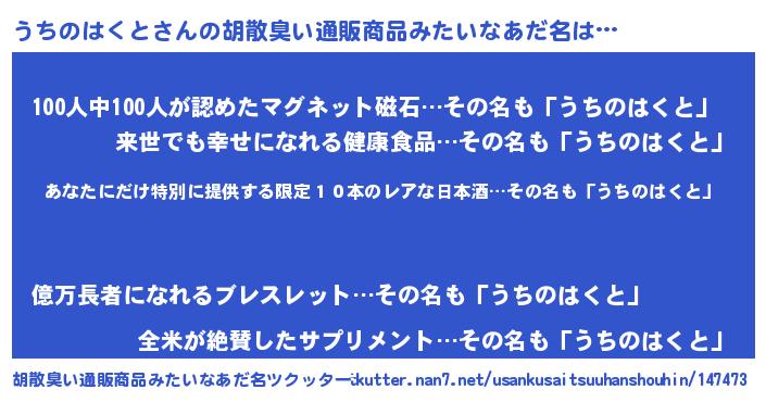 | 意味不明あだ名 | 『住所不定無職うちのはくと(50歳)』 |
