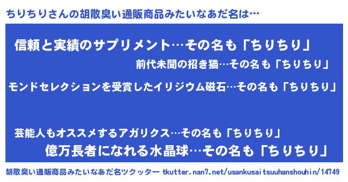 | ヒーロー風カッコイイあだ名 | 『慈愛の使者ちりちり』『暗黒騎士チリ』 |