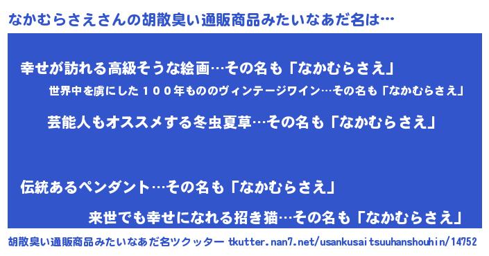 | ヘコむあだ名 | 『酢こんぶ』『なかむらさえ(震え声)』 |
