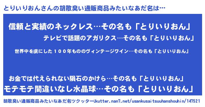 | 男性向けラノベタイトル風あだ名 | 『転生したらとりいりおんだった件』 |