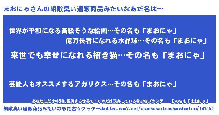 | 意味不明あだ名 | 『永久保存まおにゃ』『ペロリンまおにゃ』 |