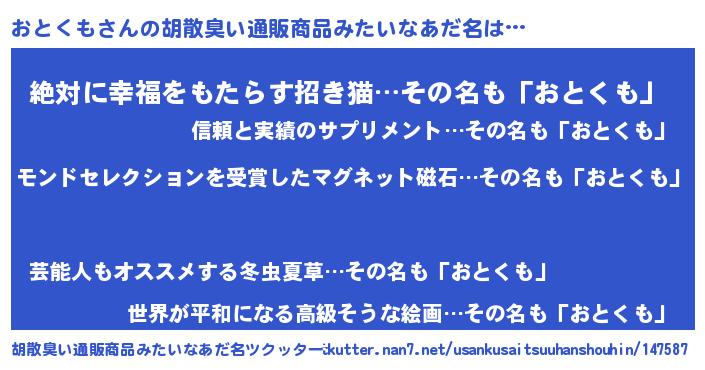 | ヒーロー風カッコイイあだ名 | 『慈愛の使者おとくも』『ネオオトクモ』 |