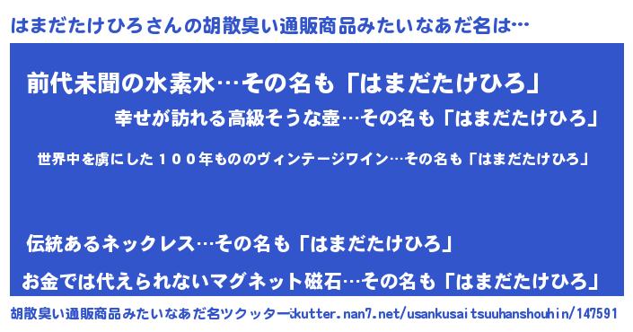 | 意味不明あだ名 | 『住所不定無職はまだたけひろ(10歳)』 |