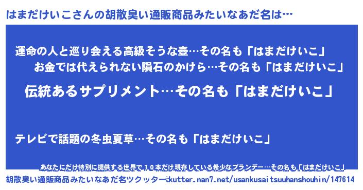 | ポケモン風あだ名 | 『ハマゴンZ』『ヒハマダケイコ』 |