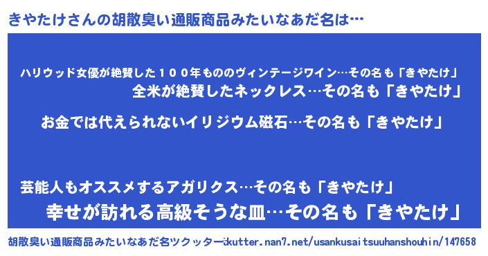 | 男性向けラノベタイトル風あだ名 | 『ノーゲーム・ノーキヤタケ』 |