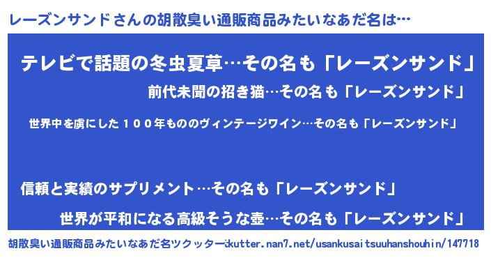 | 意味不明あだ名 | 『住所不定無職レーズンサンド(8歳)』 |