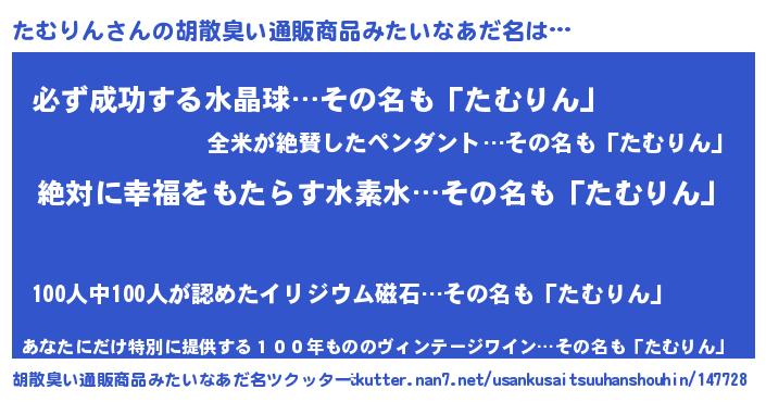 | 女子向けラノベタイトル風あだ名 | 『異世界で失敗しない100のたむりん』 |