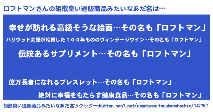 | 男性向けラノベタイトル風あだ名 | 『ロフトマンの嫁は女の子じゃないと思った?』 |