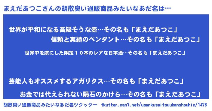| 男性向けラノベタイトル風あだ名 | 『この素晴らしい世界にまえだあつこを!』 |