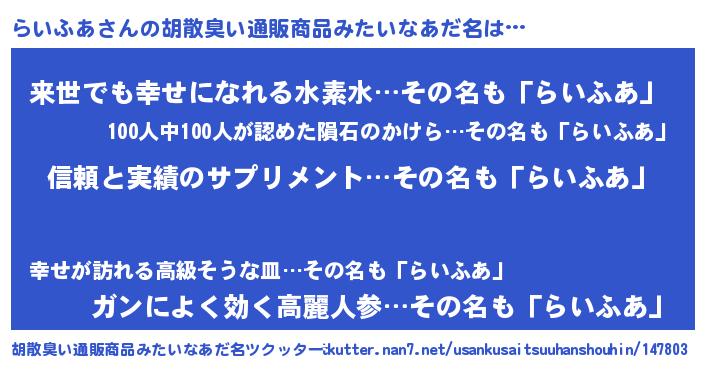 | ヘコむあだ名 | 『らい太郎』『らいふあ(遠い目)』 |