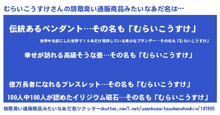 | 男性向けラノベタイトル風あだ名 | 『やはりむらいこうすけの青春ラブコメはまちがっている 』 |
