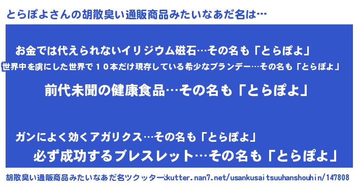 | 意味不明あだ名 | 『永久保存とらぽよ』『ペロリンとらぽよ』 |
