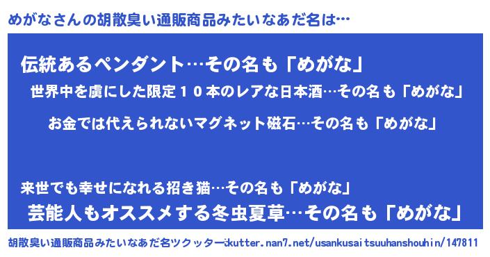 | ヘコむあだ名 | 『めがお』『めがな(苦笑)』 |