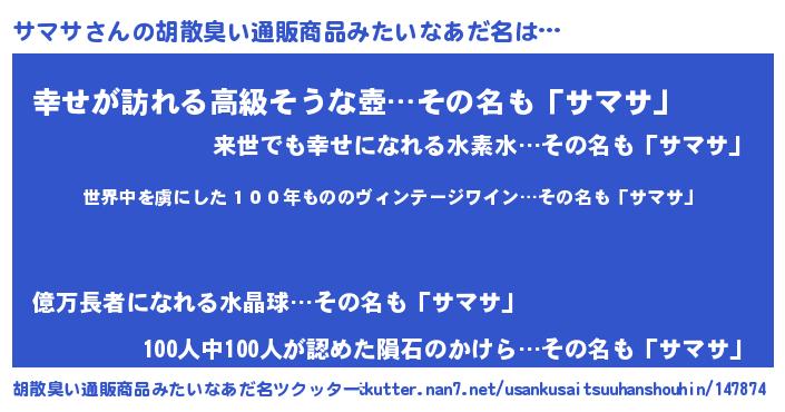 | 男性向けラノベタイトル風あだ名 | 『転生したらサマサだった件』 |