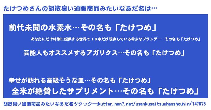 | ヘコむあだ名 | 『たけつめ(爆)』『たけっちょ』 |
