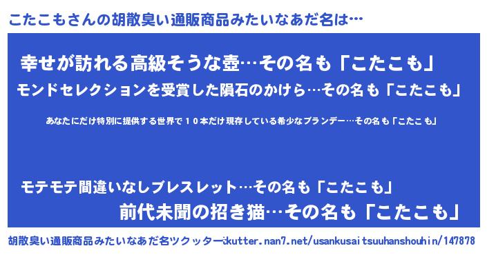 | 男性向けラノベタイトル風あだ名 | 『こたこもに滅ぼされるだけの簡単なお仕事です』 |