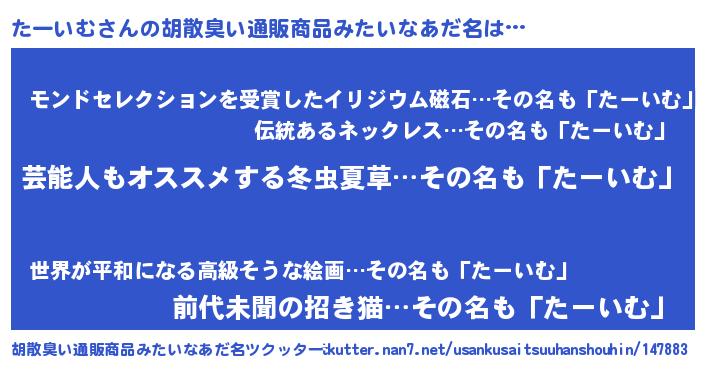 | 男性向けラノベタイトル風あだ名 | 『Re:たーいむから始める異世界生活』 |