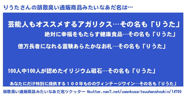 | ヘコむあだ名 | 『りうっふぃ~』『りうた(震え声)』 |