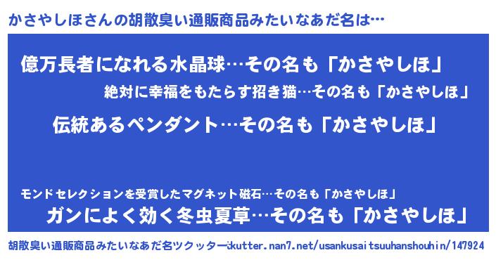 | 欧米人風あだ名 | 『ウサインかさやしほ』 |