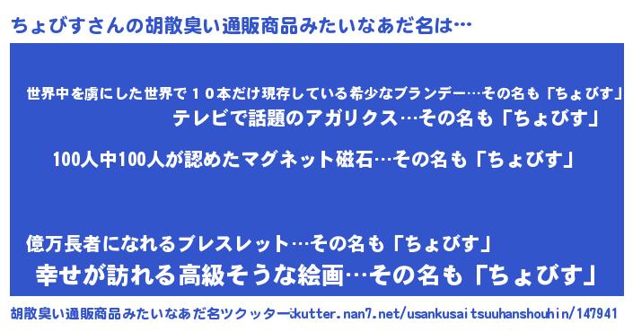 | 男性向けラノベタイトル風あだ名 | 『おまえをオタクにしてやるから、俺をちょびすにしてくれ! 』 |