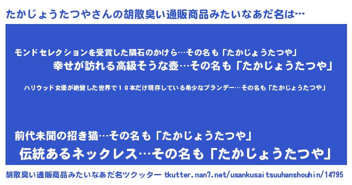 | 男性向けラノベタイトル風あだ名 | 『緋弾のタカジョウタツヤ』 |