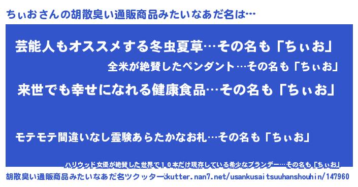 | 男性向けラノベタイトル風あだ名 | 『ちぃおという概念が存在しない退屈な世界 』 |