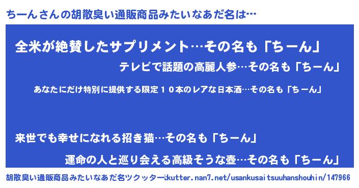 | 男性向けラノベタイトル風あだ名 | 『この素晴らしい世界にちーんを!』 |
