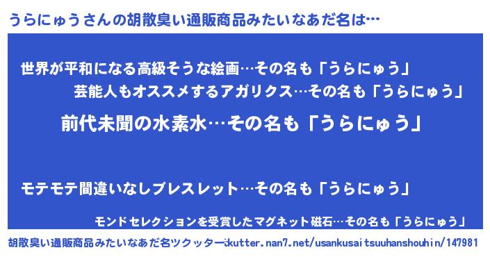 | 意味不明あだ名 | 『永久保存うらにゅう』『自称うらにゅう』 |