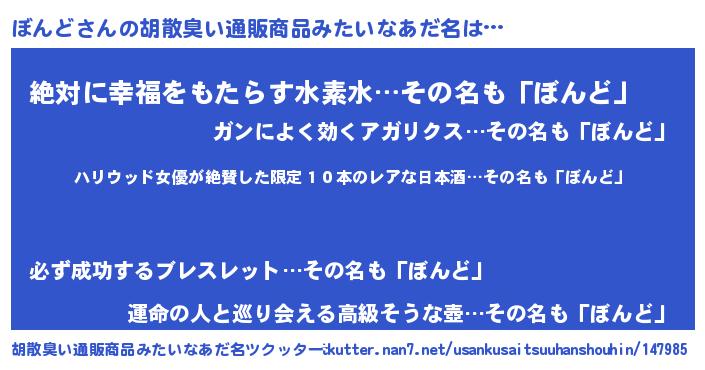 | 意味不明あだ名 | 『住所不定無職ぼんど(50歳)』『自称ぼんど』 |
