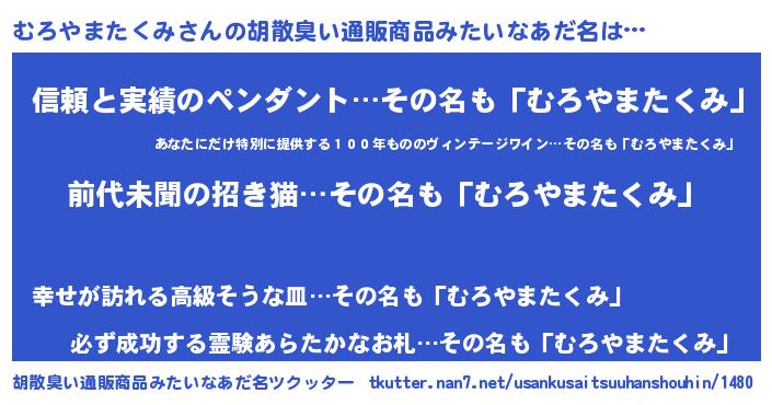 | 可愛いあだ名 | 『むろやまたくみママ』『むっろぃー』 |