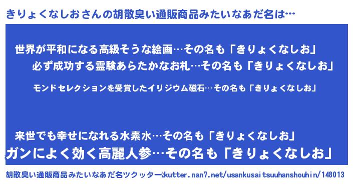 | ヒーロー風カッコイイあだ名 | 『天空の使者きりょくなしお』 |