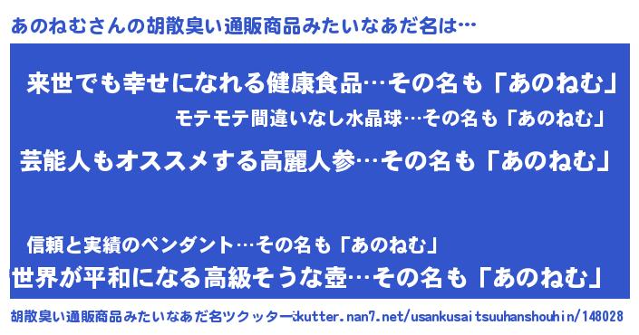 | 意味不明あだ名 | 『自称あのねむ』『永久保存あのねむ』 |