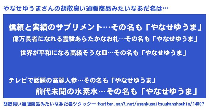 | 男性向けラノベタイトル風あだ名 | 『転生したらやなせゆうまだった件』 |