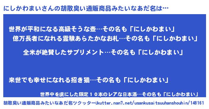 | ヘコむあだ名 | 『にしを』『つくし』『にしにゅー』 |
